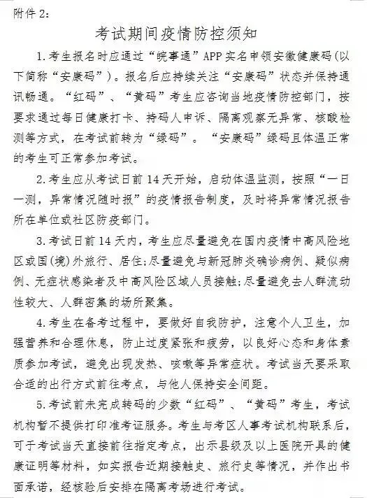報(bào)考人員報(bào)名前,應(yīng)通過“皖事通”APP實(shí)名申領(lǐng)“安康碼”。報(bào)考人員報(bào)考前請(qǐng)認(rèn)真閱讀《考試期間疫情防控須知》(附件2)。報(bào)考人員提供的信息必須與本人實(shí)際情況、報(bào)考條件和所報(bào)考的崗位要求相一致。凡弄虛作假通過資格審查,其實(shí)際情況與報(bào)考條件規(guī)定不符的,一經(jīng)查實(shí),即取消考試、聘用等資格。