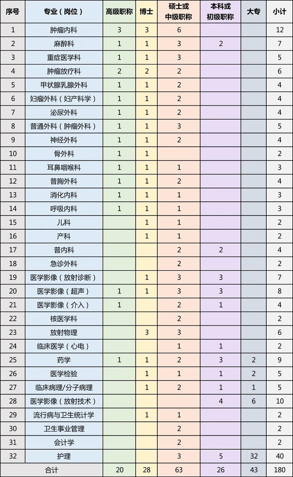 在中科院和安徽省暨合肥市的大力支持下,一所1500張床位的高水平、現(xiàn)代化三級甲等腫瘤專科醫(yī)院(高新院區(qū))正在建設(shè)中,根據(jù)醫(yī)院發(fā)展規(guī)劃,現(xiàn)面向全社會公開招聘各類專業(yè)技術(shù)人才,2020年人才招聘計劃如下: