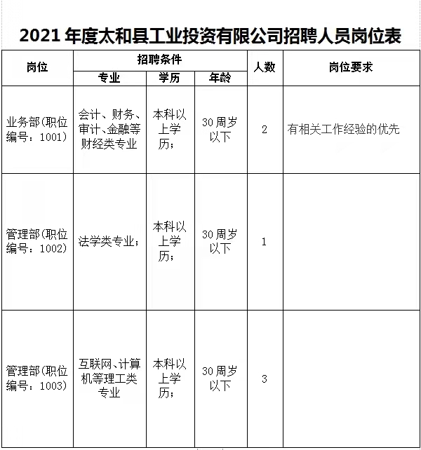 太和縣工業(yè)投資有限公司是經(jīng)太和縣人民政府批準(zhǔn),由太和縣國有資產(chǎn)管理局單獨(dú)出資設(shè)立的一家國有獨(dú)資公司。公司主營工業(yè)項(xiàng)目投資、助保金貸款、資產(chǎn)運(yùn)營、工業(yè)項(xiàng)目信息咨詢服務(wù)、基礎(chǔ)設(shè)施建設(shè)、棚戶區(qū)改造、農(nóng)村路網(wǎng)建設(shè)、農(nóng)業(yè)技術(shù)開發(fā)、污水處理等?,F(xiàn)根據(jù)公司業(yè)務(wù)發(fā)展需要,擬面向社會公開招聘6名工作人員,具體公告如下: