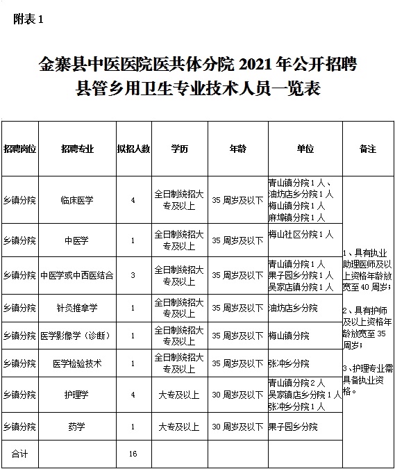 金寨縣中醫(yī)醫(yī)院醫(yī)共體分院2021年擬招聘縣管鄉(xiāng)用各類衛(wèi)生專業(yè)技術(shù)人員16名(詳見附表1)。