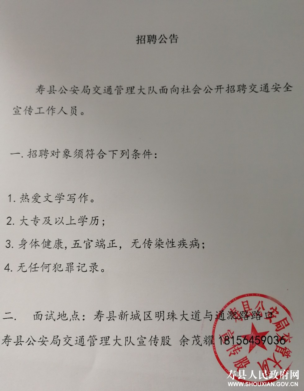 2020年淮南壽縣公安局交通管理大隊招聘交通安全宣傳工作人員公告