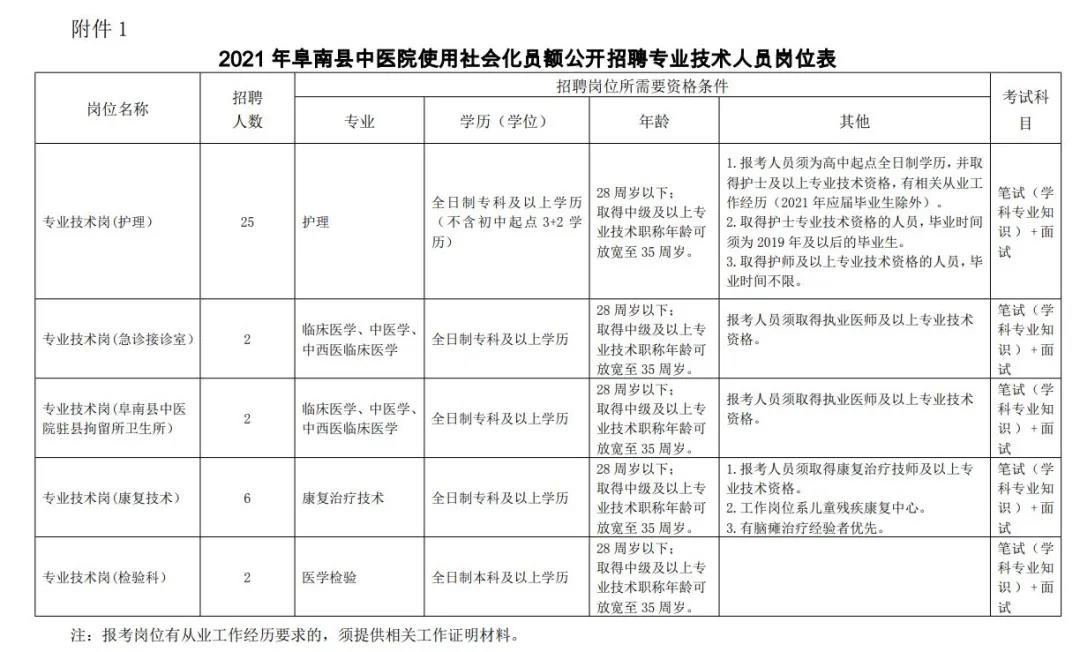 附件1:《2021年阜南縣中醫(yī)院使用社會(huì)化員額公開招聘專業(yè)技術(shù)人員崗位表》