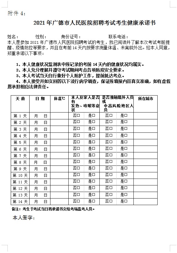 報考人員報名后,須在2021年11月10日前往廣德市人民醫(yī)院人事科領(lǐng)取準考證。根據(jù)疫情防控要求,參考資格審查人員需持健康碼,測體溫。省外考生和高中風險地區(qū)來廣人員均要持有72小時內(nèi)核酸檢測陰性證明,或提前一天到市人民醫(yī)院進行核酸檢測。