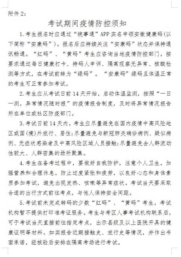 報考人員報名前,應通過“皖事通”APP實名申領(lǐng)“安康碼”。報考人員報考前請認真閱讀《考試期間疫情防控須知》(附件2)。報考人員提供的信息必須與本人實際情況、報考條件和所報考的崗位要求相一致。凡弄虛作假通過資格審查,其實際情況與報考條件規(guī)定不符的,一經(jīng)查實,即取消考試、聘用等資格。