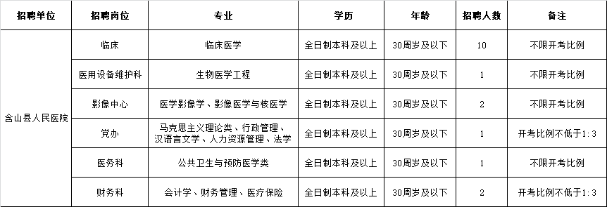 一、招聘計劃:臨床醫(yī)學10名、醫(yī)學影像學2名、財務(wù)2名、黨辦1名、公共衛(wèi)生與預(yù)防醫(yī)學1名、生物醫(yī)學工程1名,各崗位具體要求及說明詳見《含山縣人民醫(yī)院2020年公開招聘部分崗位工作人員職位表》。