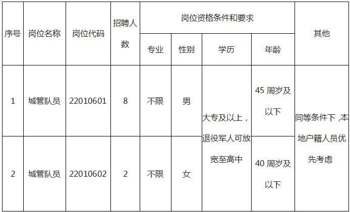 2021-12-29 22:42:09閱讀()為進(jìn)一步加強(qiáng)治安管理,提升治安管理水平和效率,現(xiàn)公開(kāi)招聘長(zhǎng)豐縣朱巷鎮(zhèn)城管隊(duì)員10名?,F(xiàn)將有關(guān)事項(xiàng)公告如下: