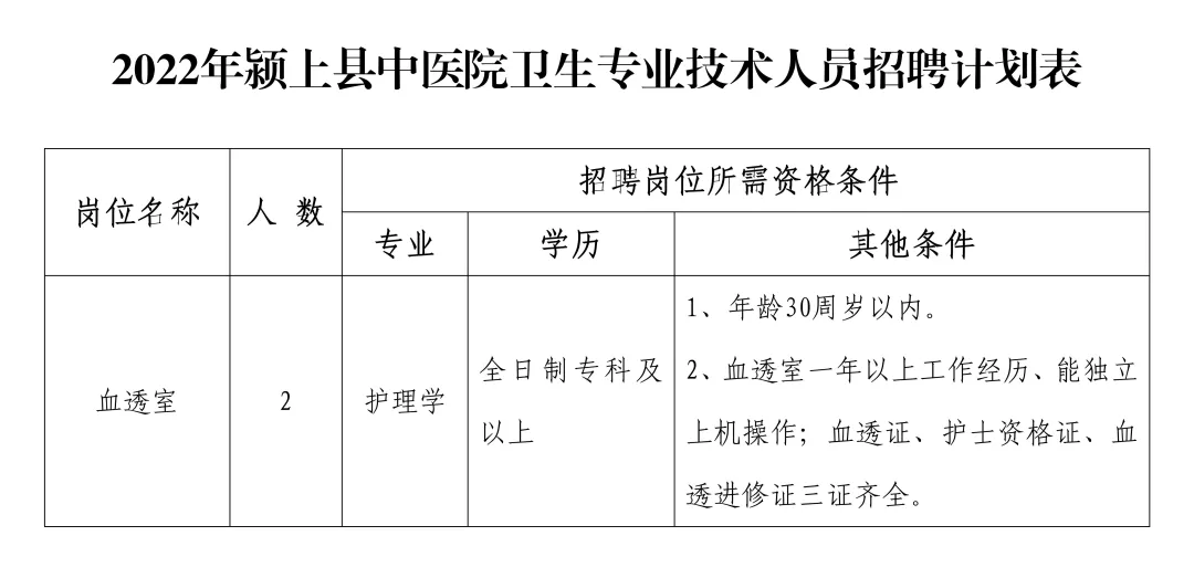 血透證、護士資格證、血透進修證三證齊全;血透室工作經(jīng)驗一年以上,能獨立上機操作。