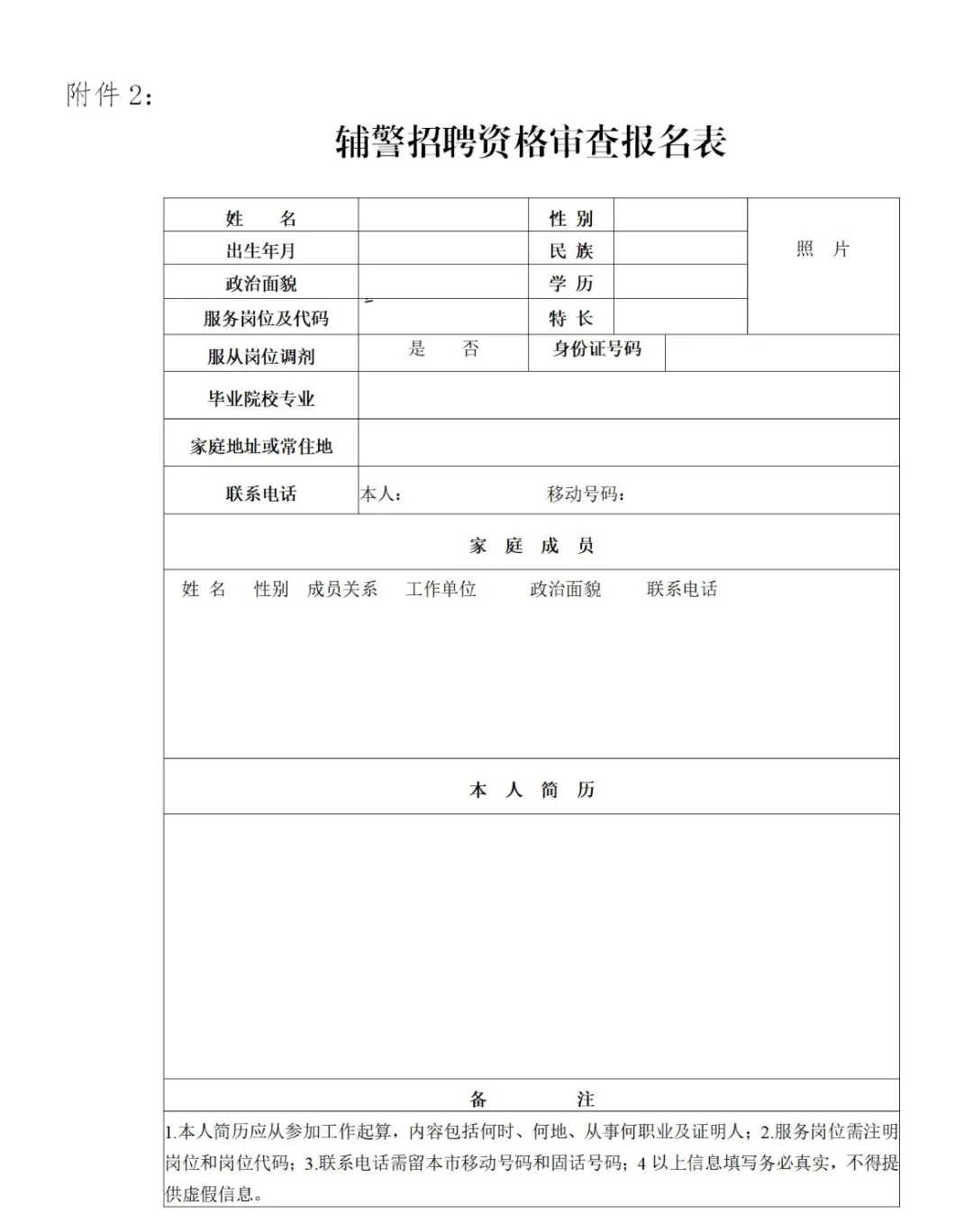 3.報(bào)名方式:以現(xiàn)場(chǎng)報(bào)名的方式進(jìn)行。報(bào)名時(shí)應(yīng)攜帶本人身份證、戶口薄、學(xué)歷證明的原件和復(fù)印件、近期2寸免冠彩色照片2張及《警務(wù)輔助人員報(bào)名表》(見(jiàn)附件2,請(qǐng)自行下載并填寫(xiě)完整)。