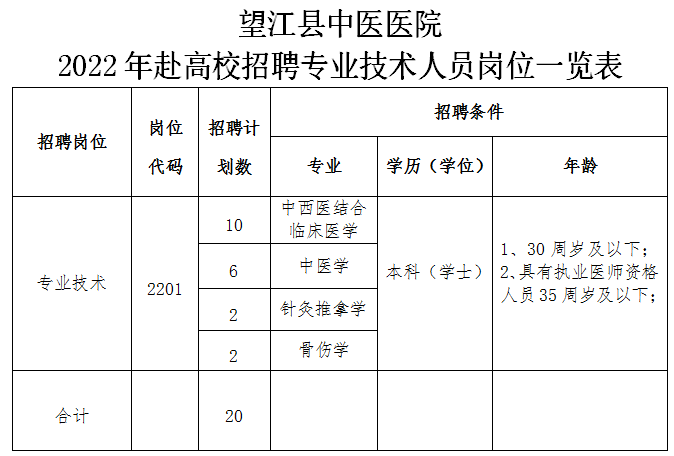 招聘崗位計(jì)劃數(shù)20個(gè)。具體招聘崗位、人數(shù)、資格條件等詳見(jiàn)《望江縣中醫(yī)醫(yī)院2022年赴高校招聘專(zhuān)業(yè)技術(shù)人員崗位一覽表》(附件1)。