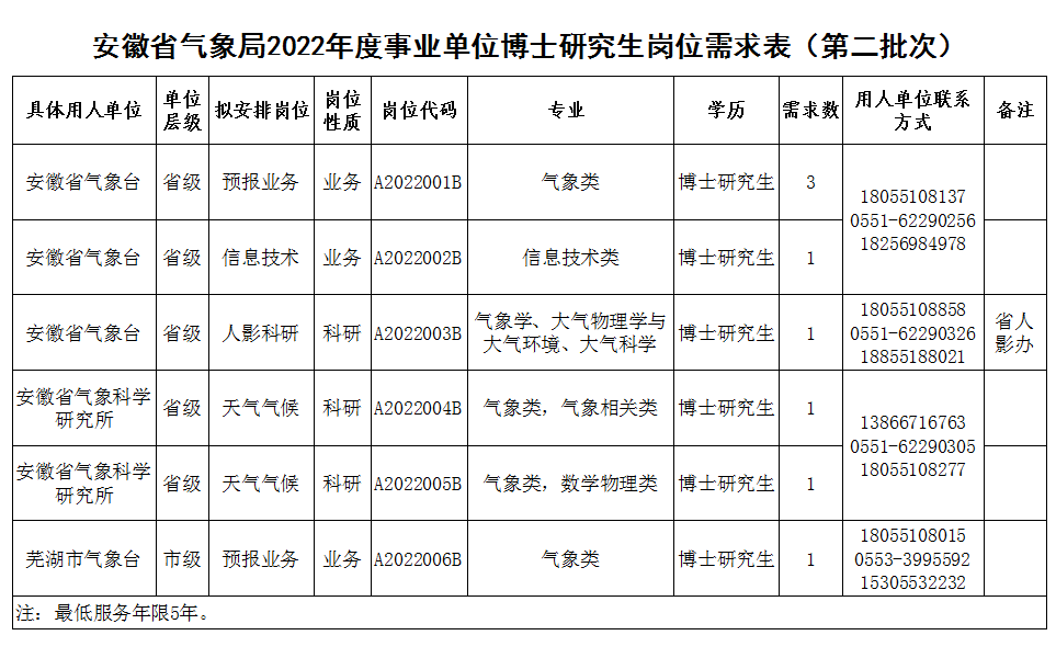 此次招聘崗位為博士崗位。具體單位、崗位、專業(yè)、學(xué)歷要求等詳見《安徽省氣象局2022年度事業(yè)單位博士研究生崗位需求表》。