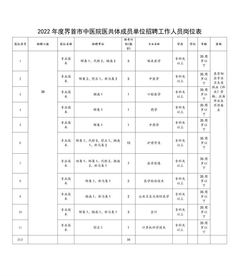 本次計劃公開招聘工作人員38人,具體招聘崗位、人數(shù)、專業(yè)、報考條件等詳見《2022年度界首市中醫(yī)院醫(yī)共體成員單位招聘工作人員崗位表》。