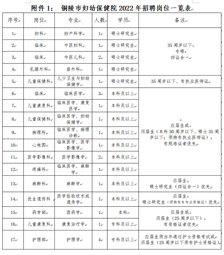 見附件1《銅陵市婦幼保健院2022年招聘崗位一覽表》