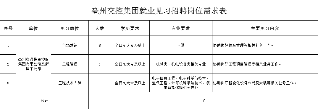 招聘崗位條件及崗位職責(zé)詳見附件《亳州交控集團就業(yè)見習(xí)招聘崗位需求表》。