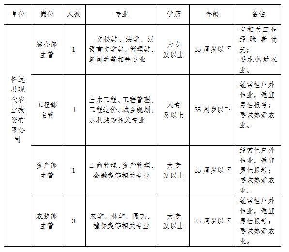 2020-06-19 22:53:01閱讀()懷遠縣人民政府懷遠縣現(xiàn)代農業(yè)投資有限公司隸屬于懷遠現(xiàn)代農業(yè)綜合開發(fā)示范區(qū),是懷遠縣政府出資設立的國有獨資公司。隨著公司業(yè)務的發(fā)展,公司現(xiàn)有人員已經無法滿足日常工作需求,為了更廣泛地選拔優(yōu)秀人才,擬面向社會公開招聘6名公司工作人員,具體招聘方案如下: