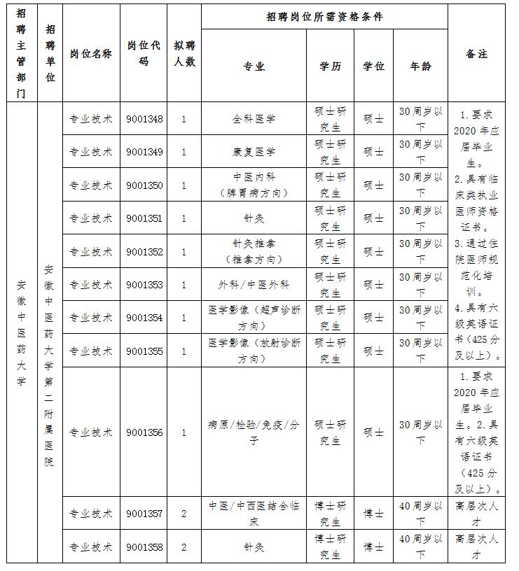 2020-06-30 22:06:24閱讀()安徽省人力資源和社會(huì)保障廳為做好2020年度安徽中醫(yī)藥大學(xué)第二附屬醫(yī)院面向社會(huì)公開招聘工作,根據(jù)《事業(yè)單位人事管理?xiàng)l例》(國務(wù)院令第652號(hào))和中共安徽省委組織部、安徽省人力資源和社會(huì)保障廳《關(guān)于印發(fā)〈安徽省事業(yè)單位公開招聘人員暫行辦法〉的通知》(皖人社發(fā)〔2010〕78號(hào))、《關(guān)于進(jìn)一步做好省屬高校公開招聘工作的通知》(皖人社秘〔2018〕369號(hào))等有關(guān)規(guī)定,現(xiàn)就有關(guān)事項(xiàng)公告如下: