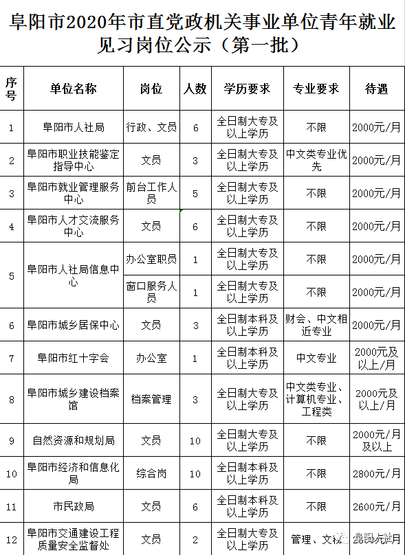 為提高高校畢業(yè)生的就業(yè)能力,根據(jù)安徽省人社廳《關于印發(fā)安徽省就業(yè)見習管理辦法的通知》(皖人社發(fā)[2017]54號)和安徽省人社廳等三部門聯(lián)合下發(fā)的《關于做好2020年機關事業(yè)單位就業(yè)見習工作的通知》(皖人社秘﹝2020﹞98號)精神,阜陽市面向市直黨政機關、事業(yè)單位(含公益一類和參公事業(yè)單位)征集就業(yè)見習崗位,吸納畢業(yè)兩年內(nèi)未就業(yè)的高校畢業(yè)生參加就業(yè)見習?,F(xiàn)公告如下: