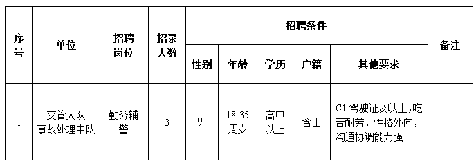 交通事故處理中隊勤務(wù)輔警3名。