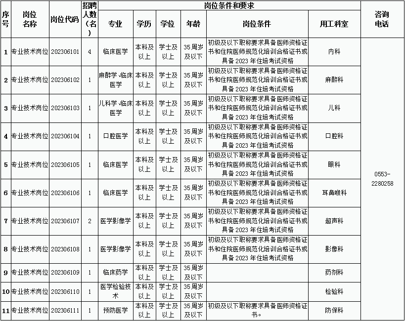 蕪湖市六院2023年公開(kāi)招聘編內(nèi)工作人員崗位表(預(yù)公告)