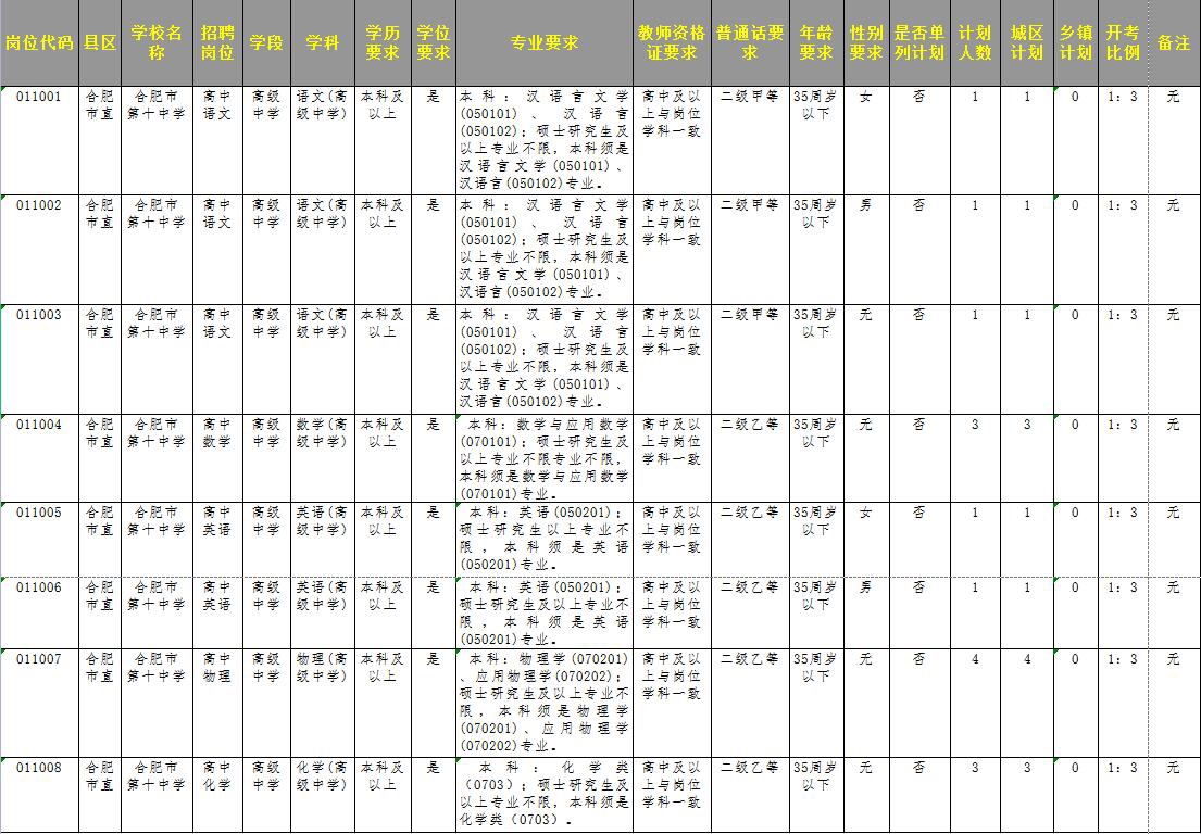 根據(jù)合肥市教育局、合肥市人力資源和社會(huì)保障局聯(lián)合發(fā)布的《2023年度合肥市直屬學(xué)校新任教師公開招聘公告》,合肥十中此次共招聘語文(3人)、英語(2人)、數(shù)學(xué)(3人)、物理(4人)、化學(xué)(3人)教師15名,具體崗位要求如下: