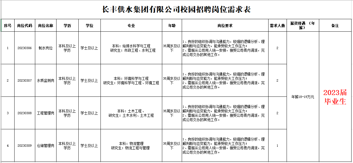 長豐供水集團(tuán)有限公司系長豐縣屬國有企業(yè)。注冊資金3個(gè)億,市值18億。集團(tuán)公司下轄14個(gè)鄉(xiāng)鎮(zhèn)供水所、3個(gè)制水廠、4個(gè)子公司。因工作需要,合肥慧豐人才服務(wù)有限公司受長豐供水集團(tuán)有限公司委托,現(xiàn)面向校園招聘工作人員7名,現(xiàn)將有關(guān)事項(xiàng)公告如下: