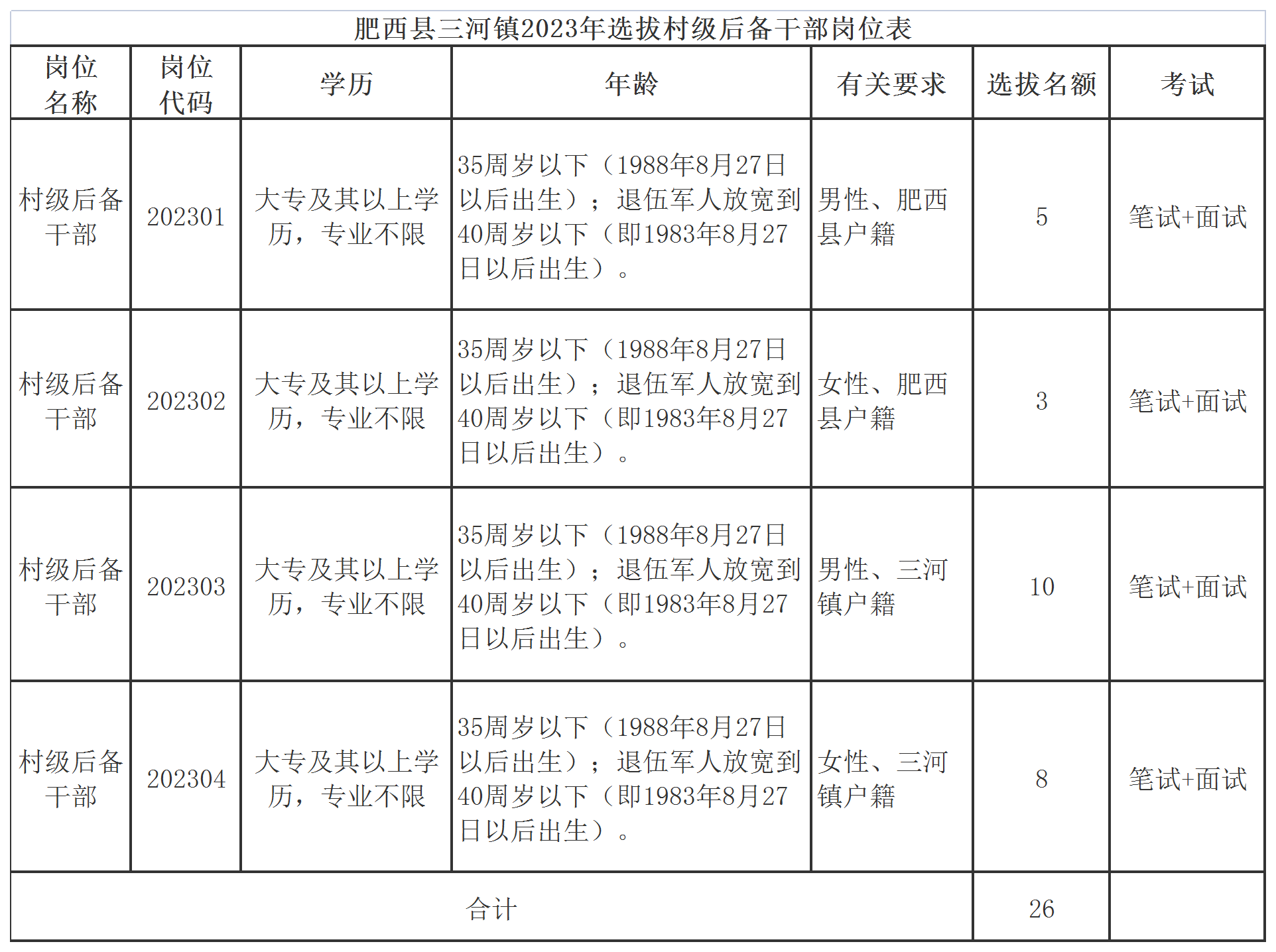 計(jì)劃選拔26名村級后備干部,其中肥西縣戶籍8名,三河鎮(zhèn)戶籍18名。詳見附表。