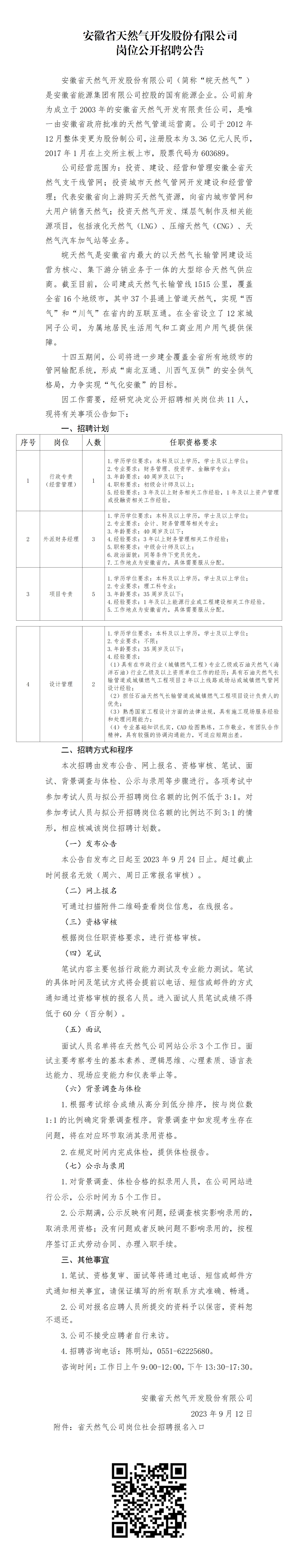 2023年安徽省天然氣開發(fā)股份有限公司崗位公開招聘公告(二)
